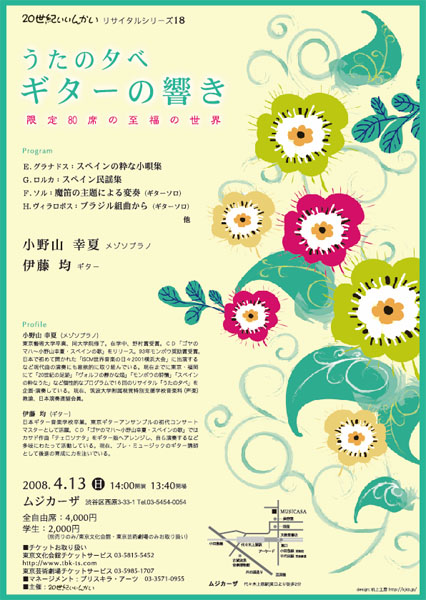 | 出演 小野山 幸夏(メゾソプラノ)/伊藤均(ギター) 曲目 E.グラナドス:スペインの粋な小唄集 G.ロルカ:スペイン民謡集 F.ソル:魔笛の主題による変奏(ギターソロ) H.ヴィラロボス:ブラジル組曲から(ギターソロ) 他 全自由席 一 般:4,000円 /学生:2,000円(前売りのみ) ※ ※東京文化会館、東京芸術劇場のみお取り扱い チケットお取り扱い 東京文化会館チケットサービス 03-5815-5452 東京芸術劇場チケットサービス 03-5985-1707 マネージメント:プリスキラ・アーツ 03-3571-0955 主催 20世紀いいんかい |