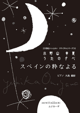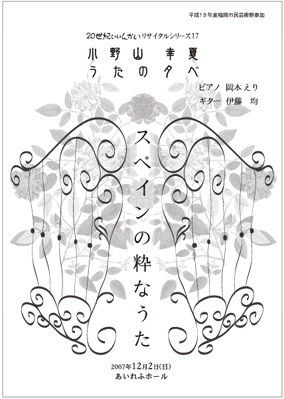 ンの粋なよる 出演 小野山 幸夏(メゾソプラノ)/大島 義彰(ピアノ) 曲目 トゥリーナ:歌のかたちの詩 ファリャ:スペインの7つの民謡 ドビュッシー:グラナダの夕べ(ピアノソロ) ラヴェル:道化師の朝の歌(ピアノソロ) ニン:カタルーニャの民謡 他 全自由席 一 般:4,000円 /学生:2,000円(前売りのみ)※/通し券:5,000円(シリーズ16・17) ※ ※東京文化会館のみお取扱い スペインの粋なうた 出演 小野山 幸夏(メゾソプラノ)/岡本 えり(ピアノ)/伊藤 均(ギター) 曲目 トゥリーナ:歌のかたちの詩 ファリャ:スペインの7つの民謡 グラナドス:スペインの粋な小唄集 演奏会用アレグロ(ピアノソロ) アルベニス:グラナダ(ギターソロ) 他 全自由席 一 般:3,000円 /学生:2,000円(前売りのみ)※/通し券:5,000円(シリーズ16・17) ※ ※東京文化会館のみお取扱い チケットお取り扱い 東京文化会館チケットサービス 03-5815-5452/マネージメント:プリスキラ・アーツ 03-3571-0955 主催 20世紀いいんかい 092-851-5517 |